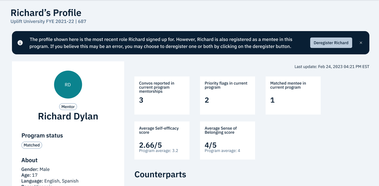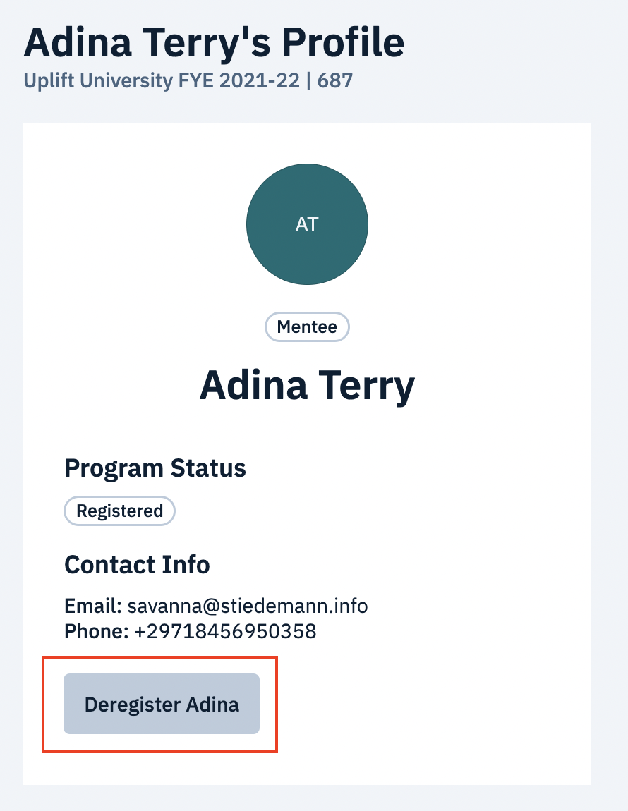 If you find a participant in this situation, you will largely follow the same process as any other individual participant. However, you will need to specify which participant type you would like to deregister: mentor or mentee.