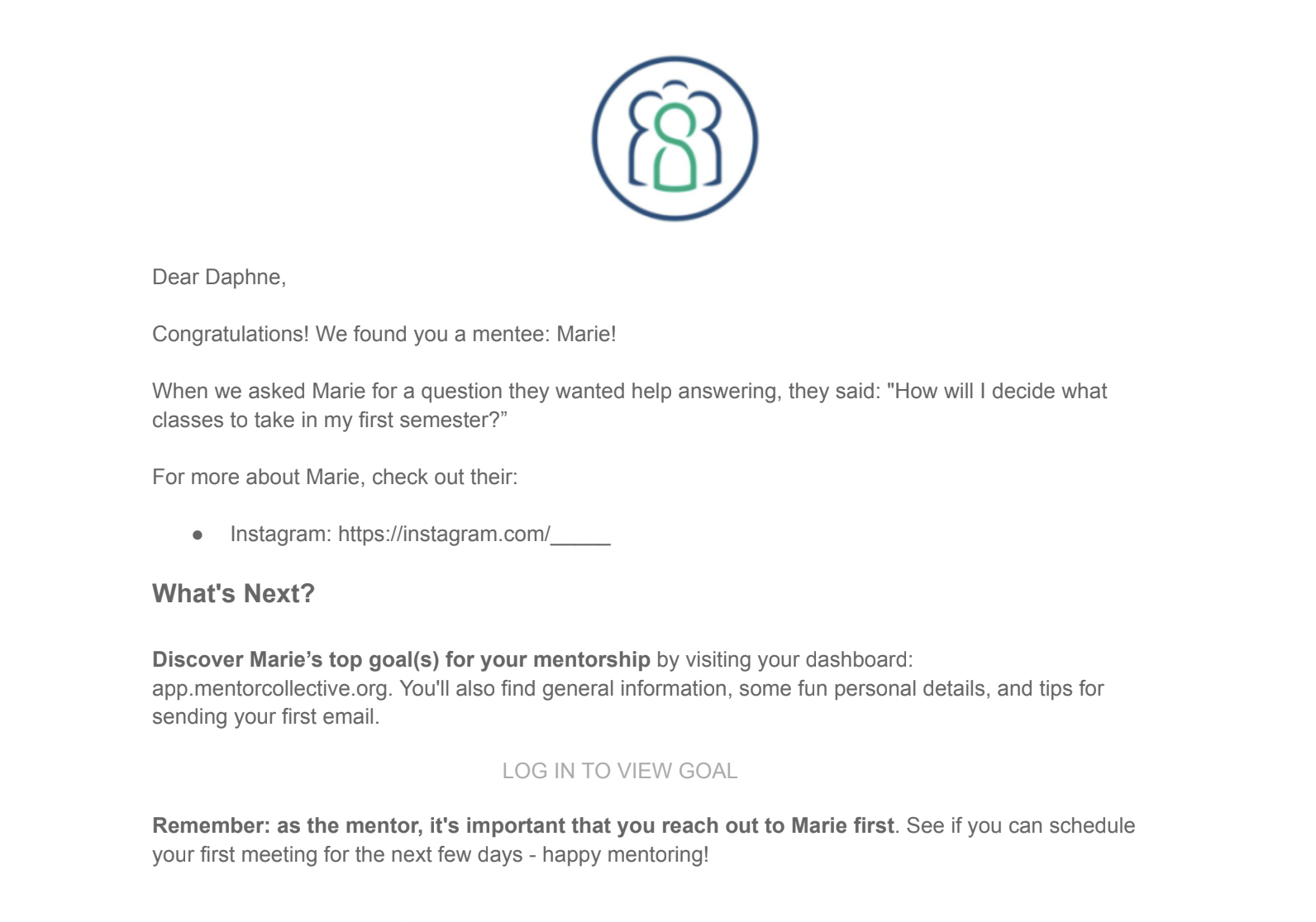 Participants will automatically receive match messaging, which will inform them that they were matched, provide insight into their counterpart, and encourage them to make initial contact.