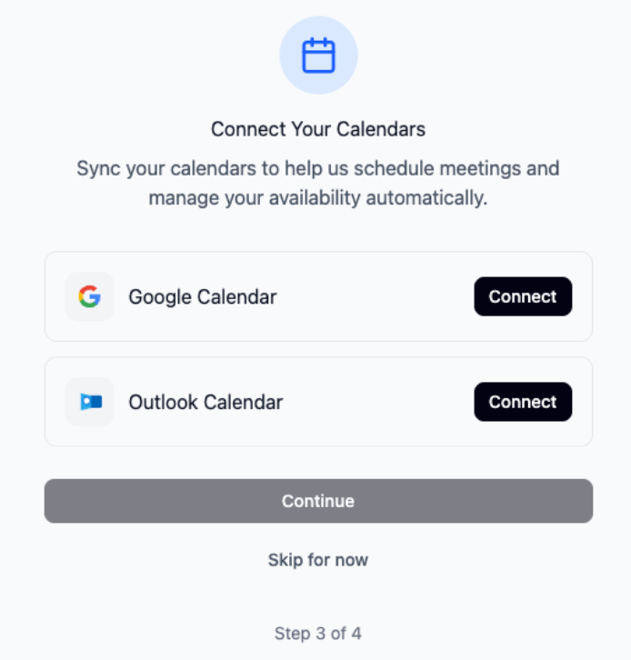 - Onboarding Integration: Participants are prompted to connect their Google or Outlook calendars during the initial registration flow.
