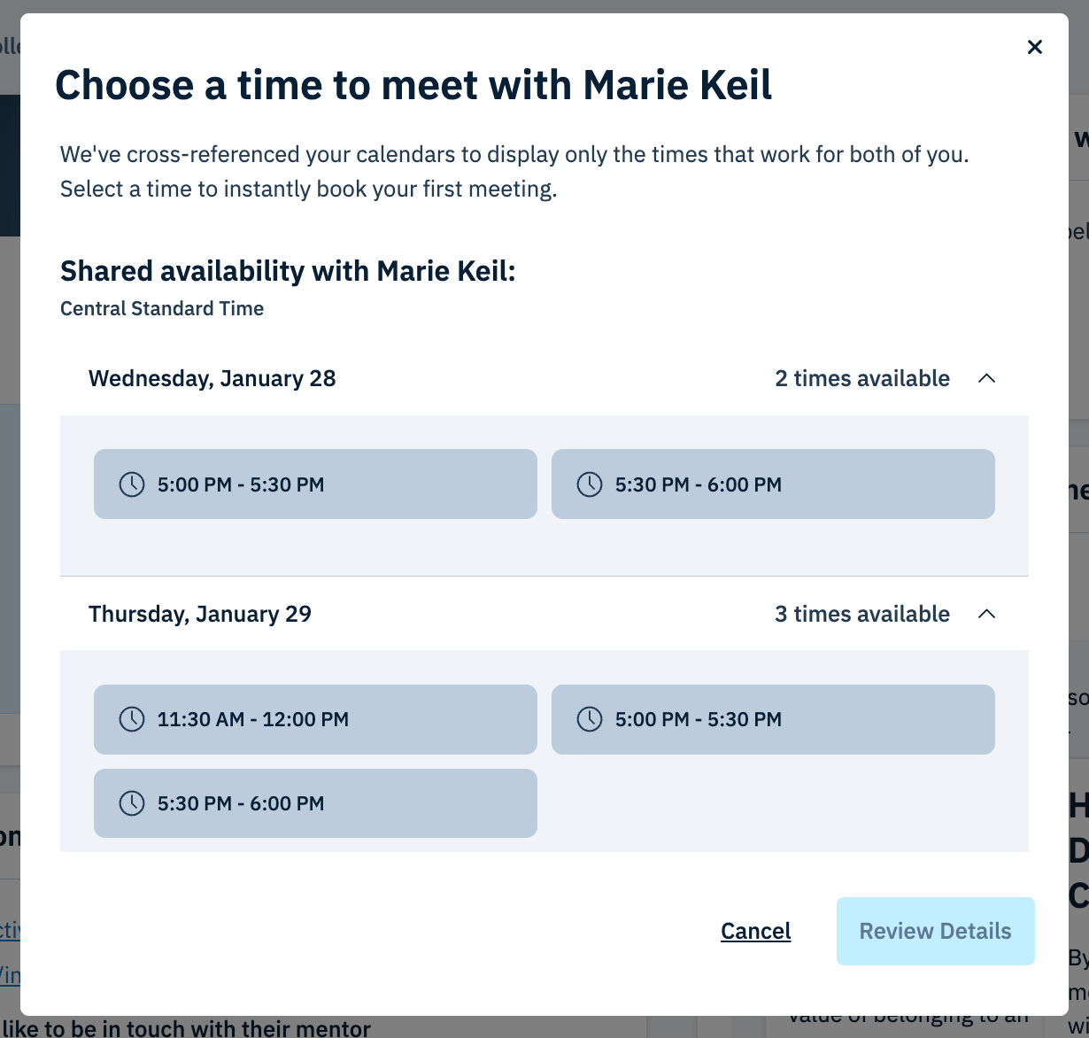 Smart Scheduling turns the intent to meet into a meaningful connection. Instead of back-and-forth emails and texts, mentors and mentees can now see exactly when their counterpart is free and secure a meeting in seconds.