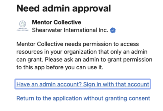 If you see a “Need admin approval” or “Approval required” message, continue to the steps below to grant admin consent.